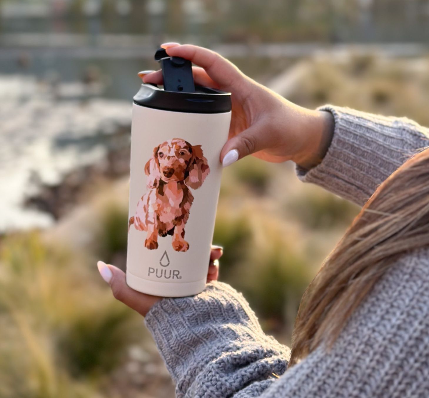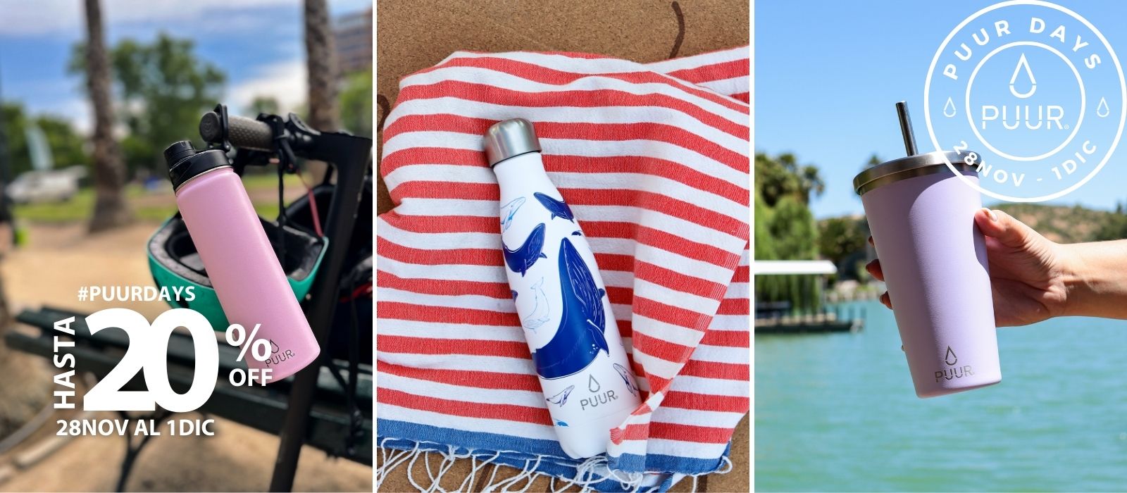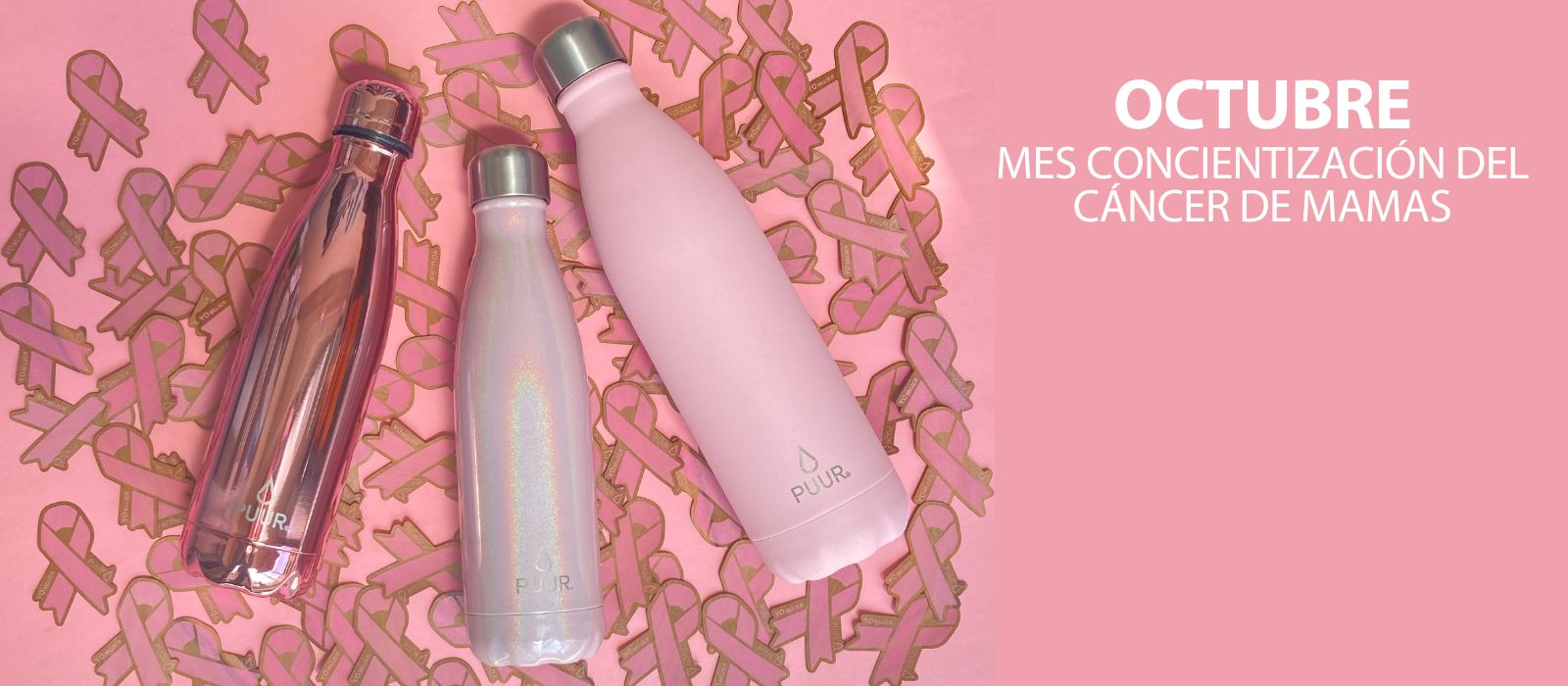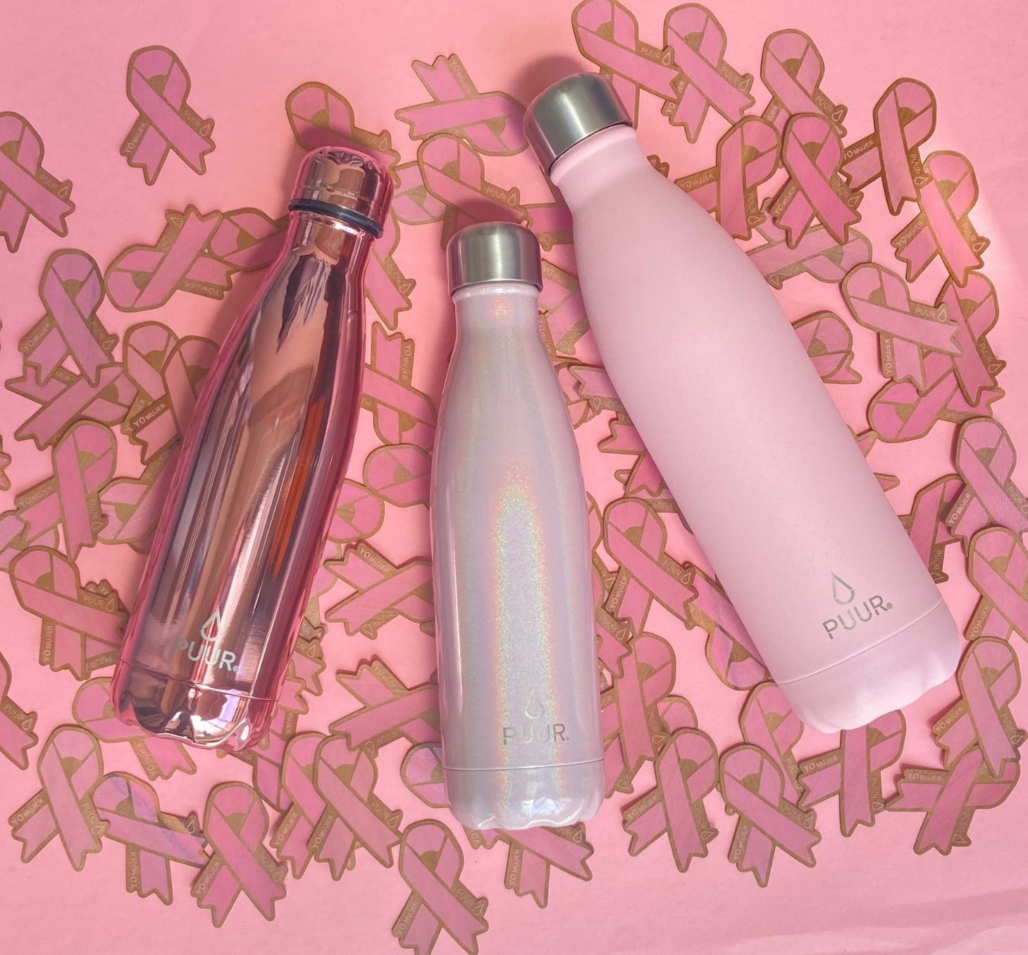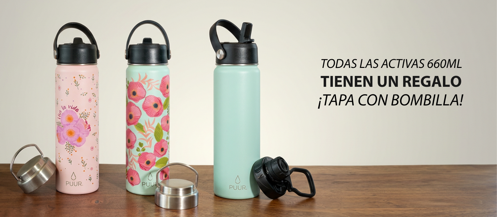 Nuestras Puur Bottle, diseñadas con doble pared de acero inoxidable, libres de condensación y BPA, mantienen la temperatura de los líquidos durante horas.
