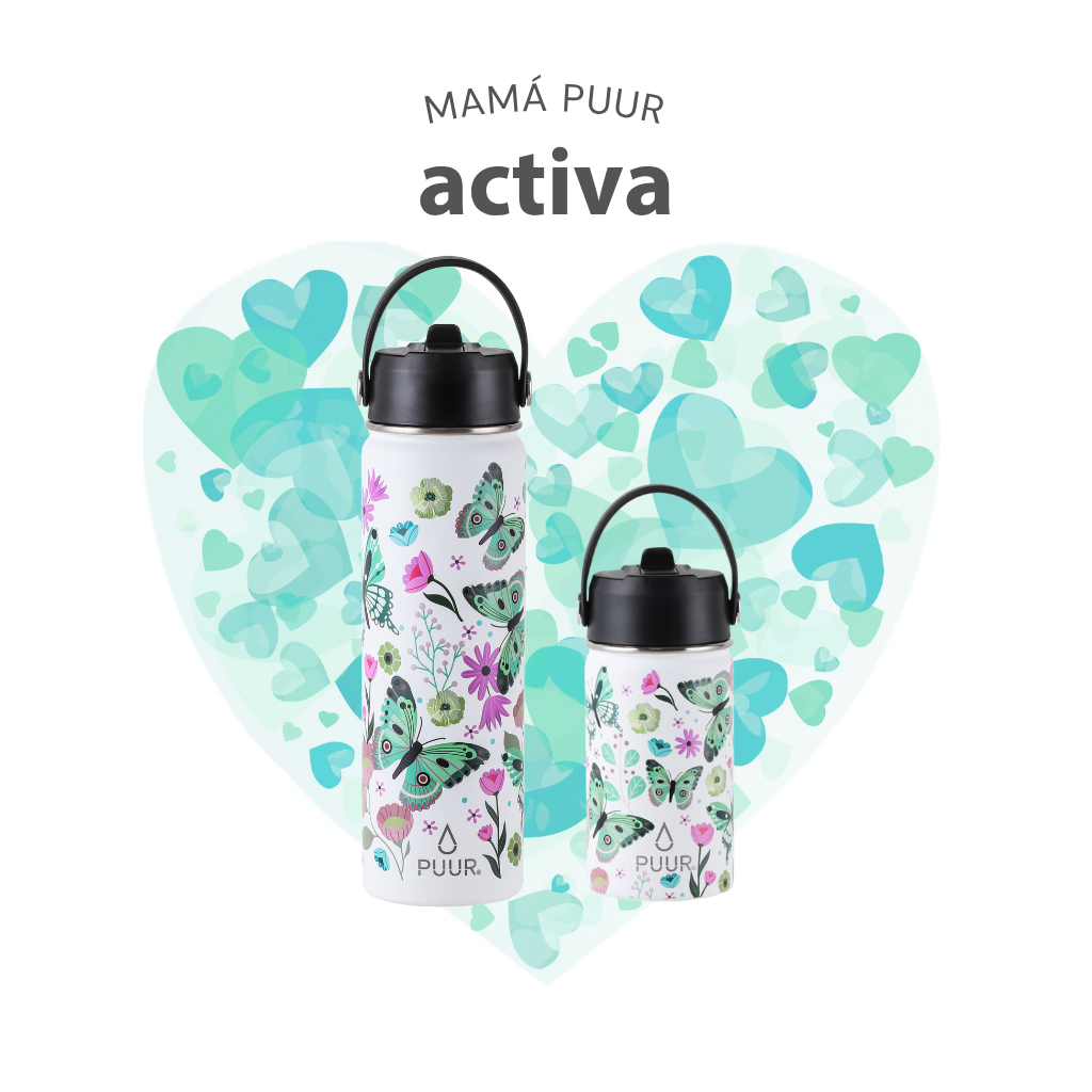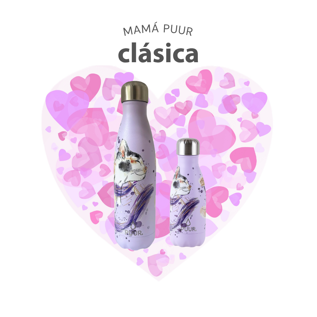 Nuestras Puur Bottle, diseñadas con doble pared de acero inoxidable, libres de condensación y BPA, mantienen la temperatura de los líquidos durante horas.