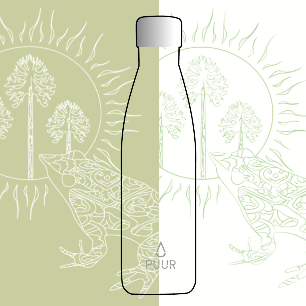 Fusionamos el estilo Art Nouveau con la flora y fauna del sur de Chile, incorporando una ranita de Darwin y un sol adornado con araucarias.
