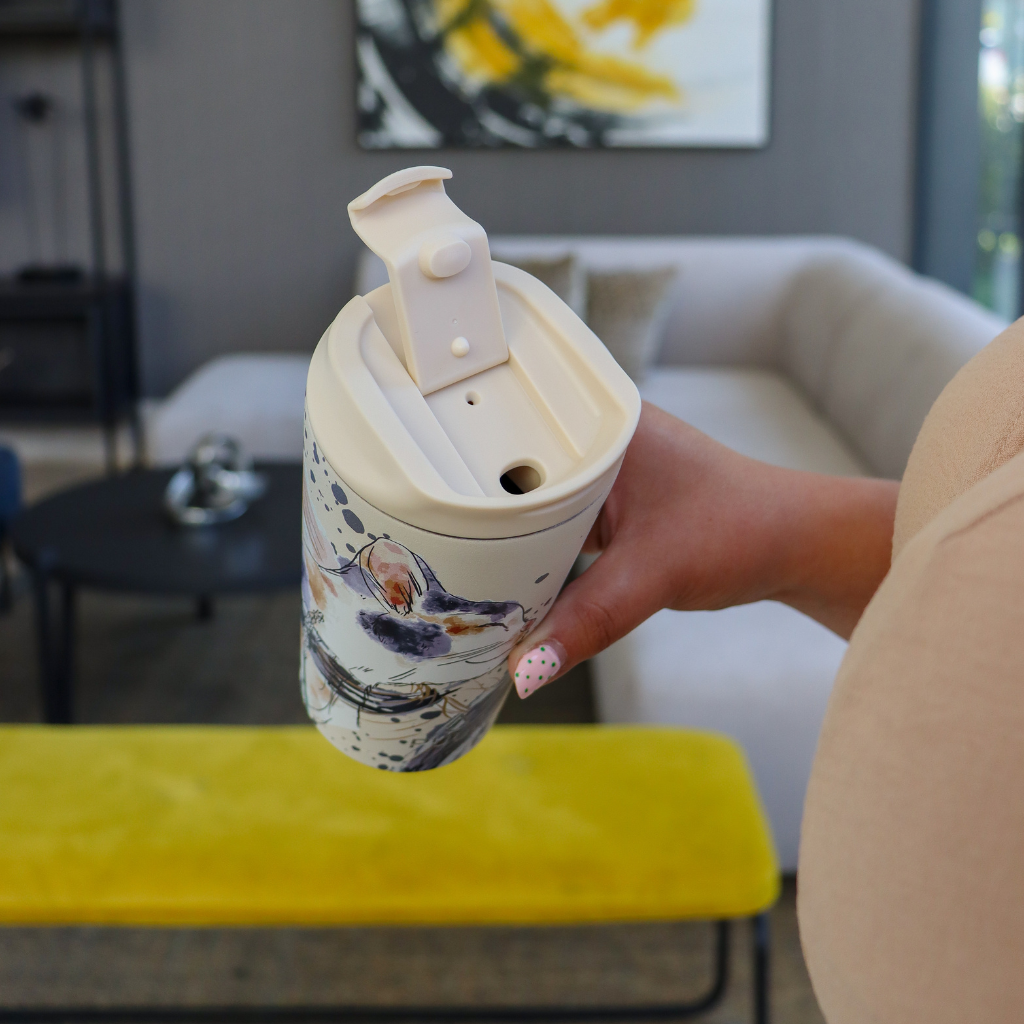 • El Mug Cat Sand 470 ml encanta con su ilustración artística de gato sobre un fondo arena, combinando ternura y estilo en un diseño único que mantiene tus bebidas a la temperatura ideal.