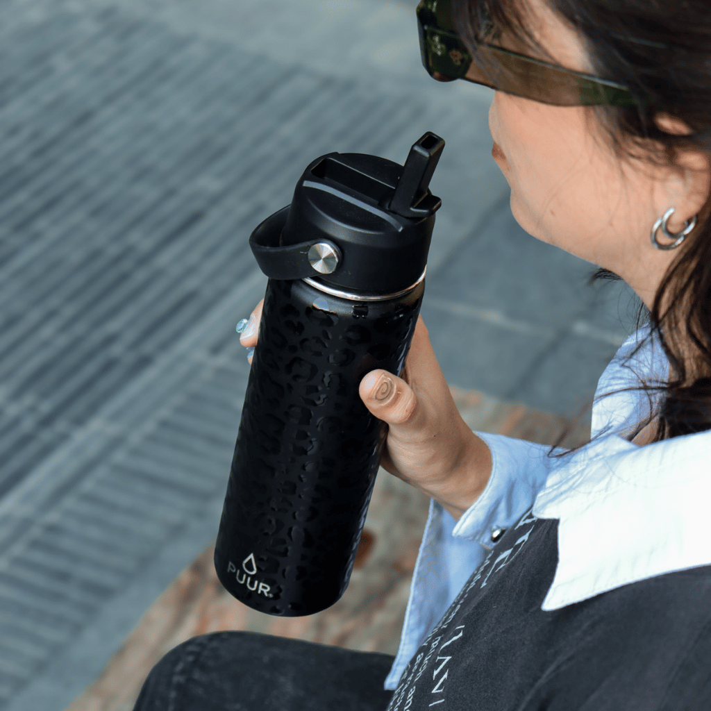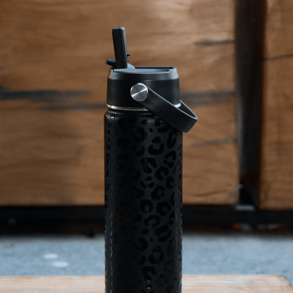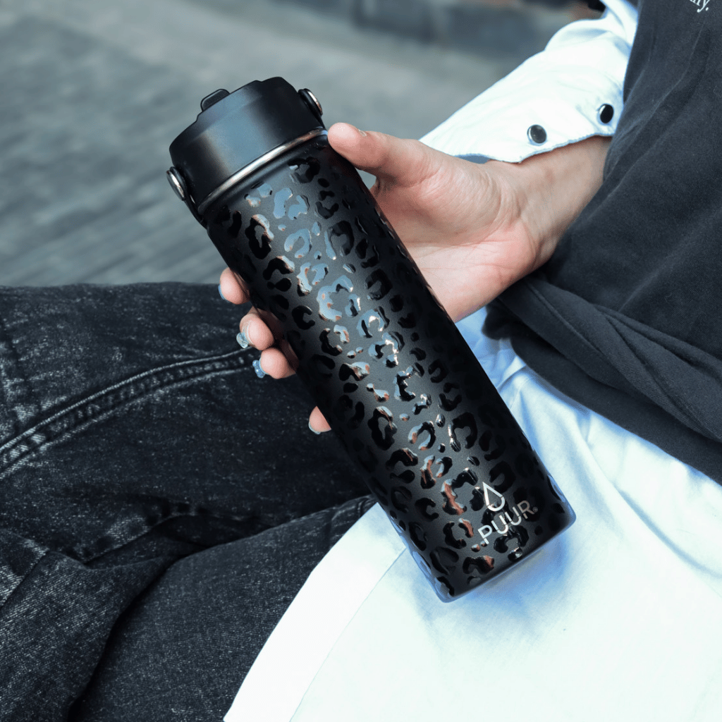 • Botella Activa Panther 660 ml en negro con sutil estampado animal print en relieve. Un diseño moderno, audaz y lleno de textura, ideal para quienes buscan un estilo sofisticado con un detalle distintivo.